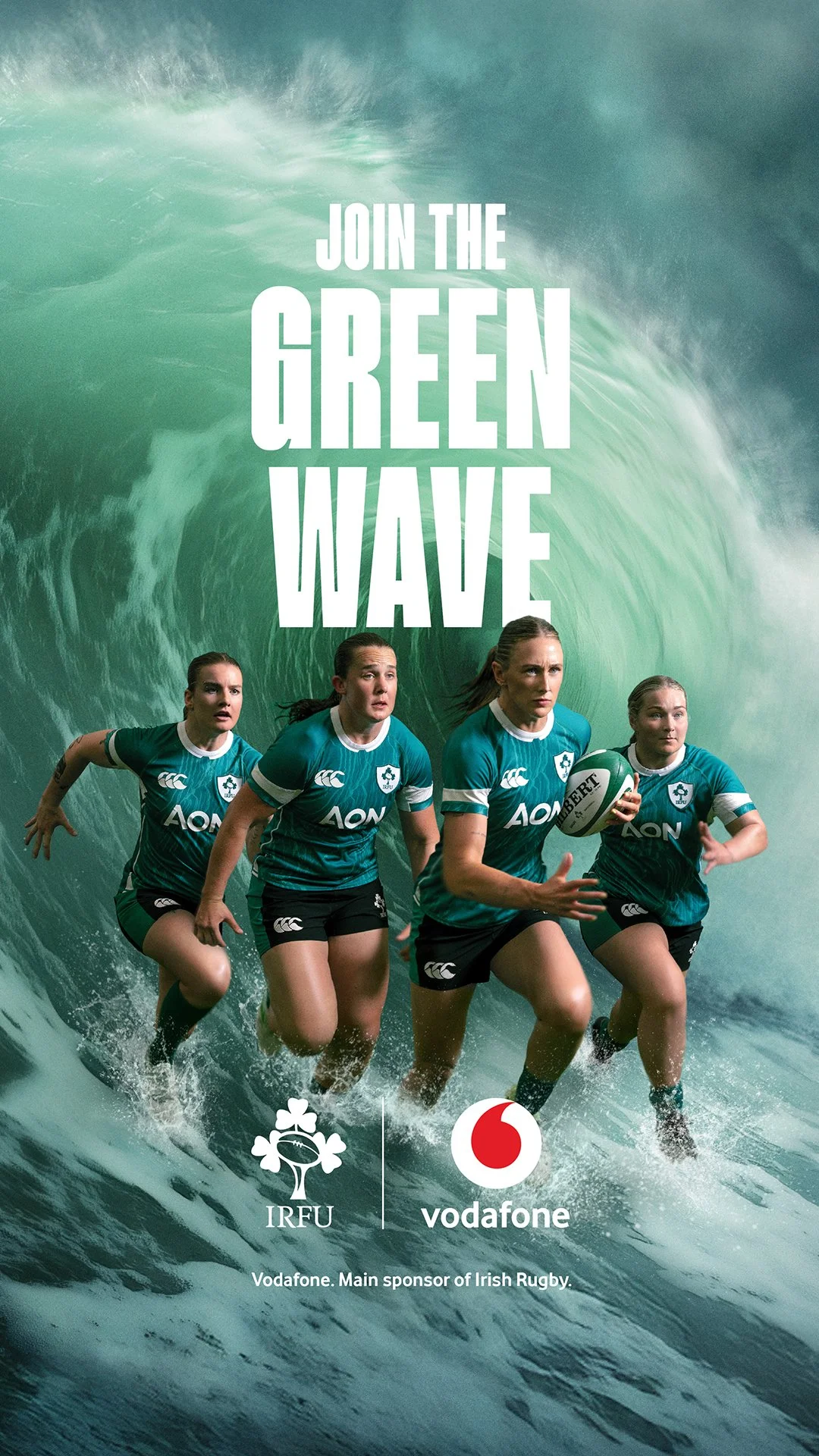 For our hero key visual we brought to life a larger than life Green Wave, showing Irish players bursting out of it - a representation of the kinetic energy and power of the movement, almost propelling the players forward as they outrun it.